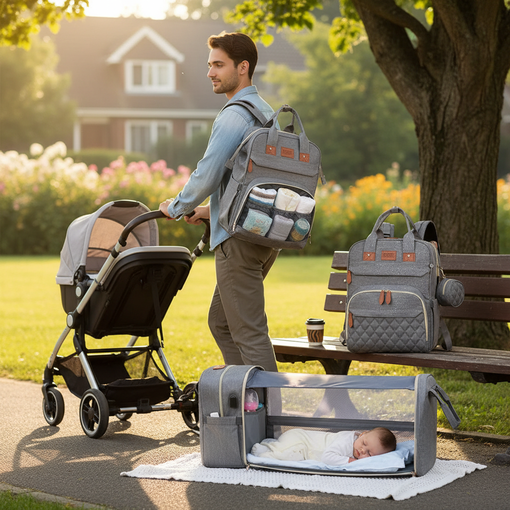 Transform your diaper bag into a comfortable baby bed in seconds. Perfect for travel, outings, and everyday use.